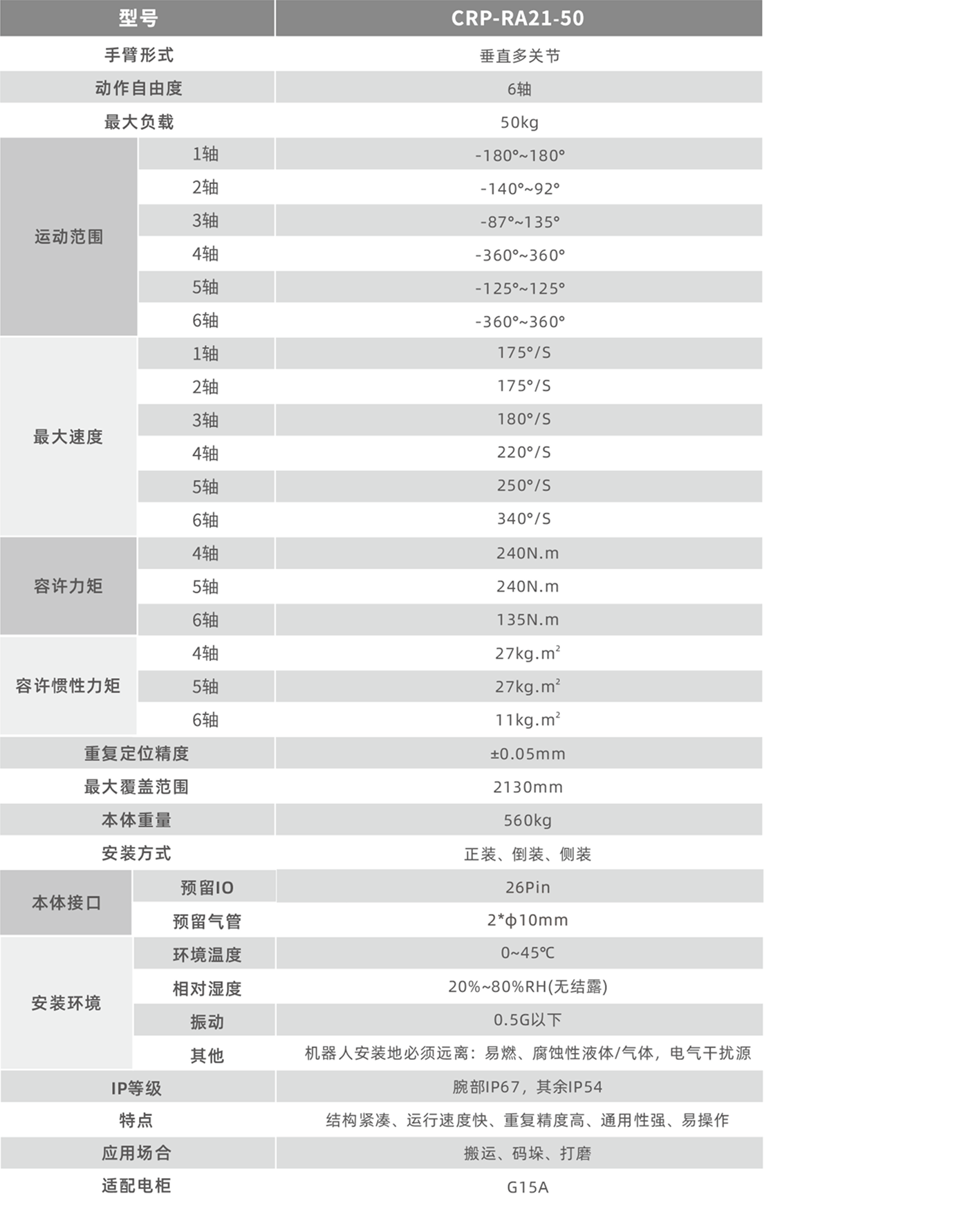 运行速度快,重复定位精度,适用于搬运、装配、打磨等场景。