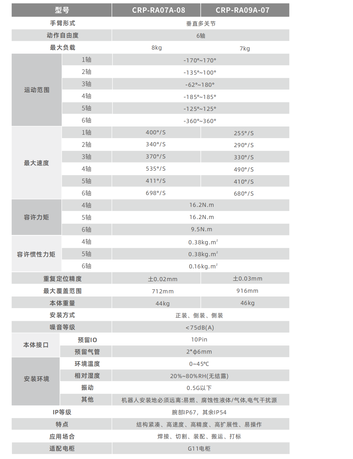 臂长712mm,手腕负载容量大,额定负载8kg,可轻松应对多种应用场合。